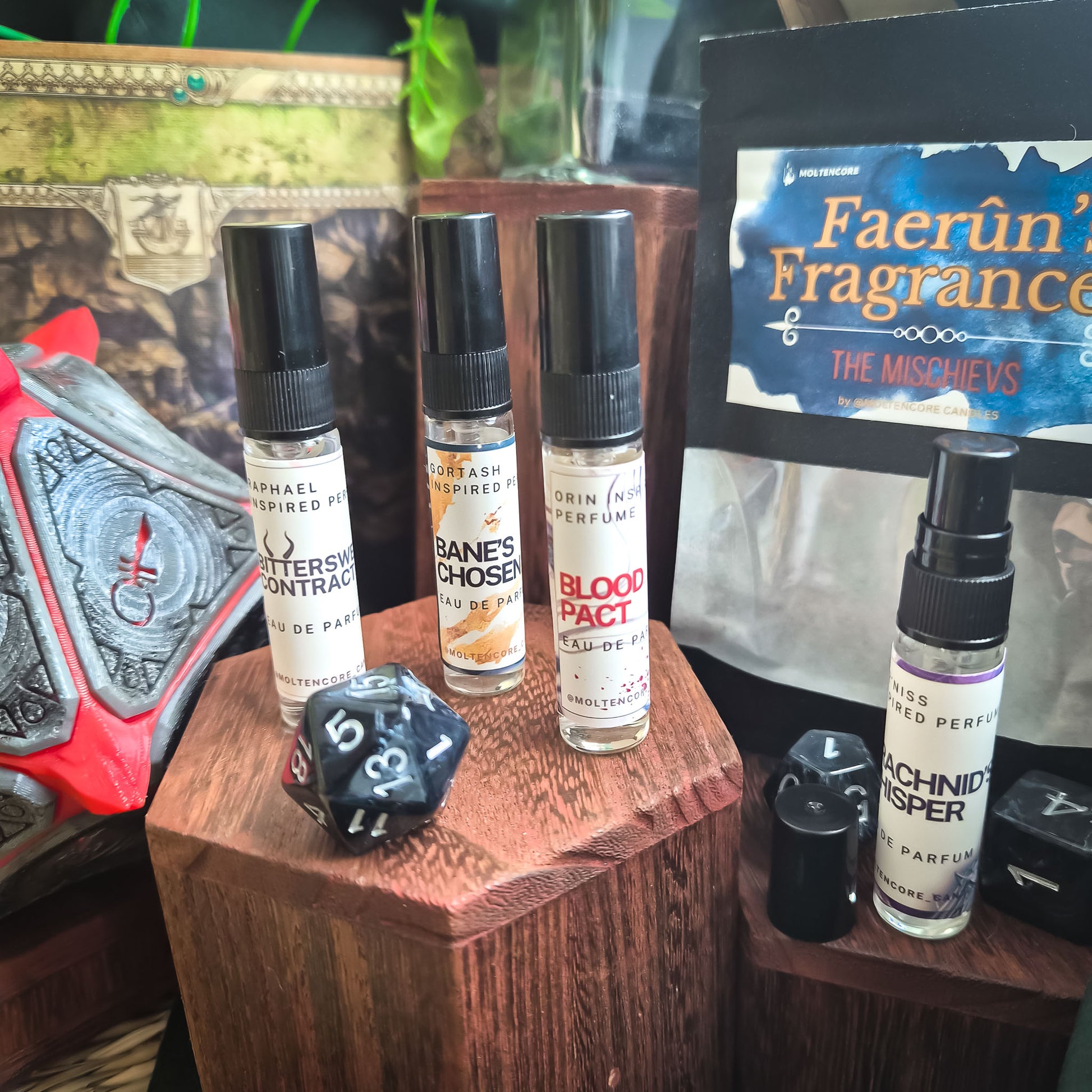 After months of design and blending, I’m beyond excited to reveal the Mischiefs Perfume Set—a collection dedicated to the darker side of Faerûn. Each bottle embodies the seductive, treacherous, and unforgettable aura of Baldur’s Gate’s most notorious schemers.